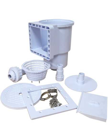 La piscine est fournie avec un skimmer complet de haute qualité, incluant : le corps du skimmer, le cadre, le joint en caoutchouc d’étanchéité, la visserie, le panier de préfiltration, la cloison (comporte), deux raccords, l’adaptateur de skimmer, les colliers de serrage ainsi que la buse de refoulement.